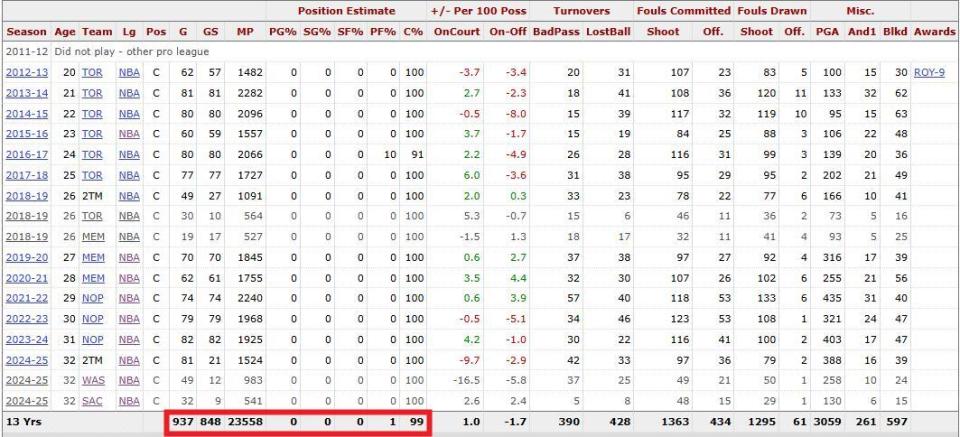 说明点一:位置。NBA生涯至今的937场合计23558分钟里瓦兰占比99%打五号位。